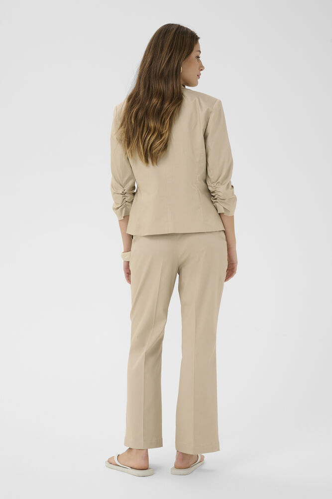 Il possède des manches 3/4 froncées, un col à revers cranté et deux poches à rabat devant.