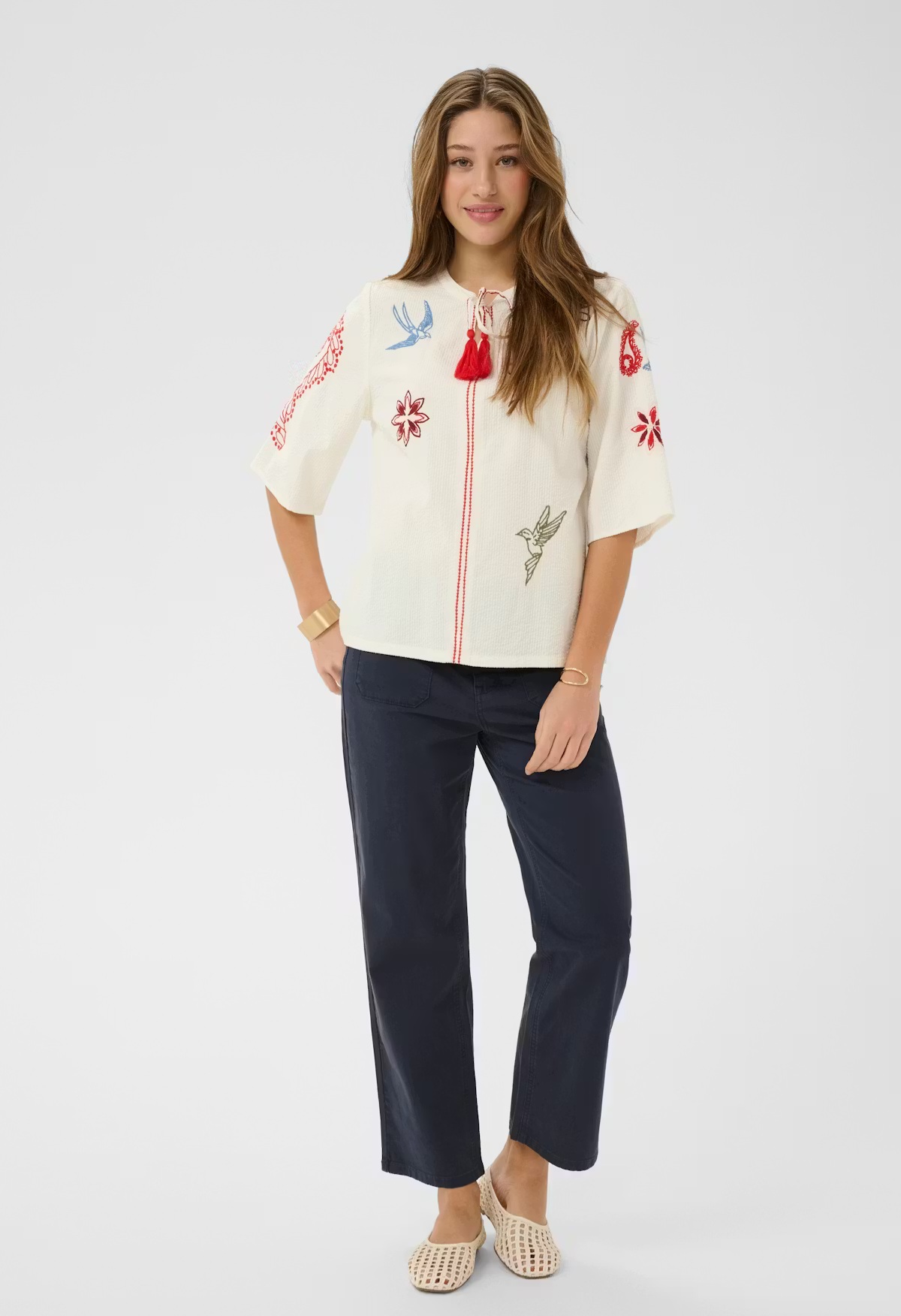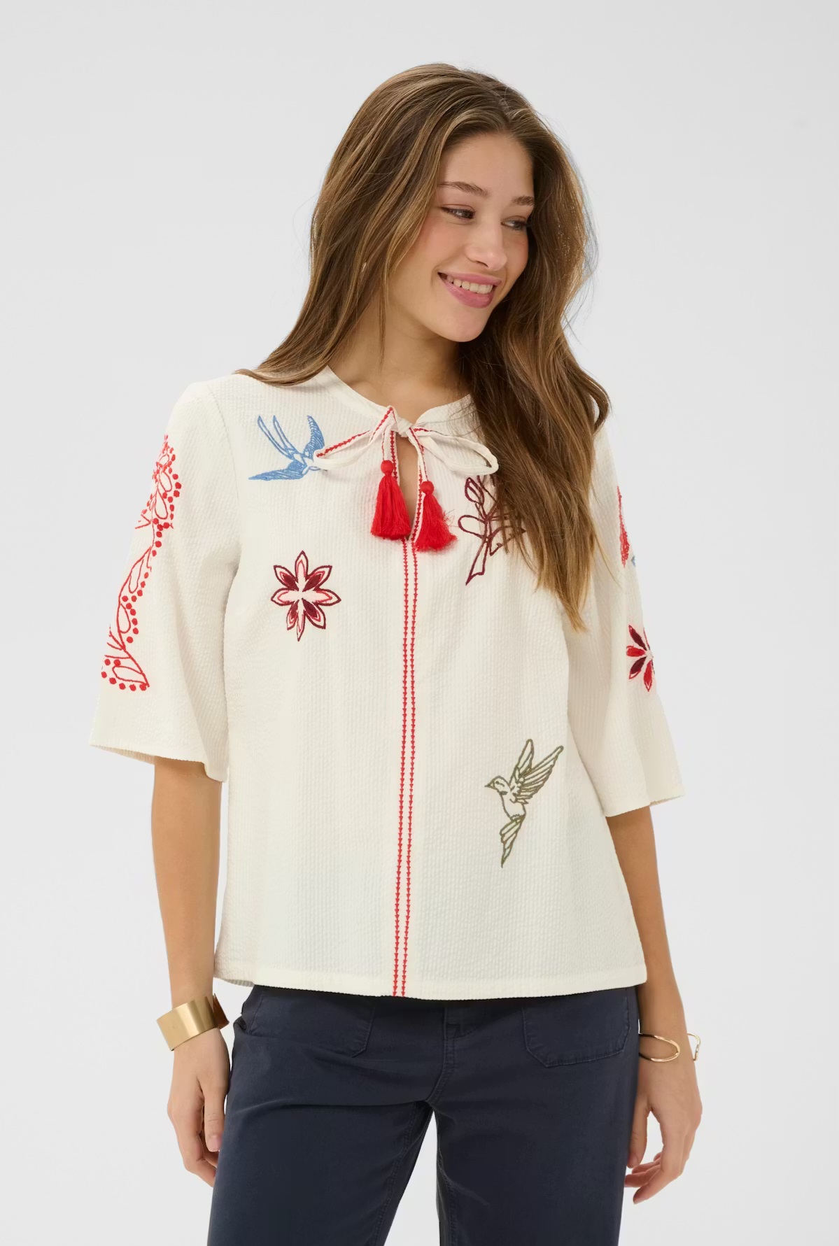 Broderies contrastées sur le devant et les manches.