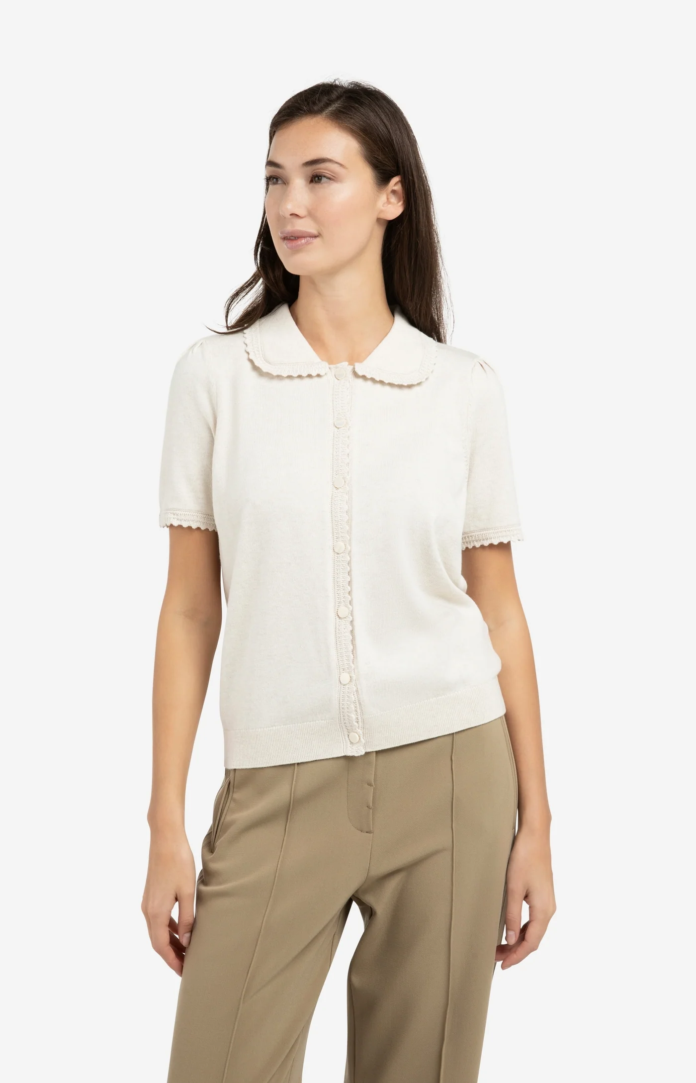 Ce cardigan doux en maille fine a des manches courtes, un col et une fermeture à boutons à l’avant.