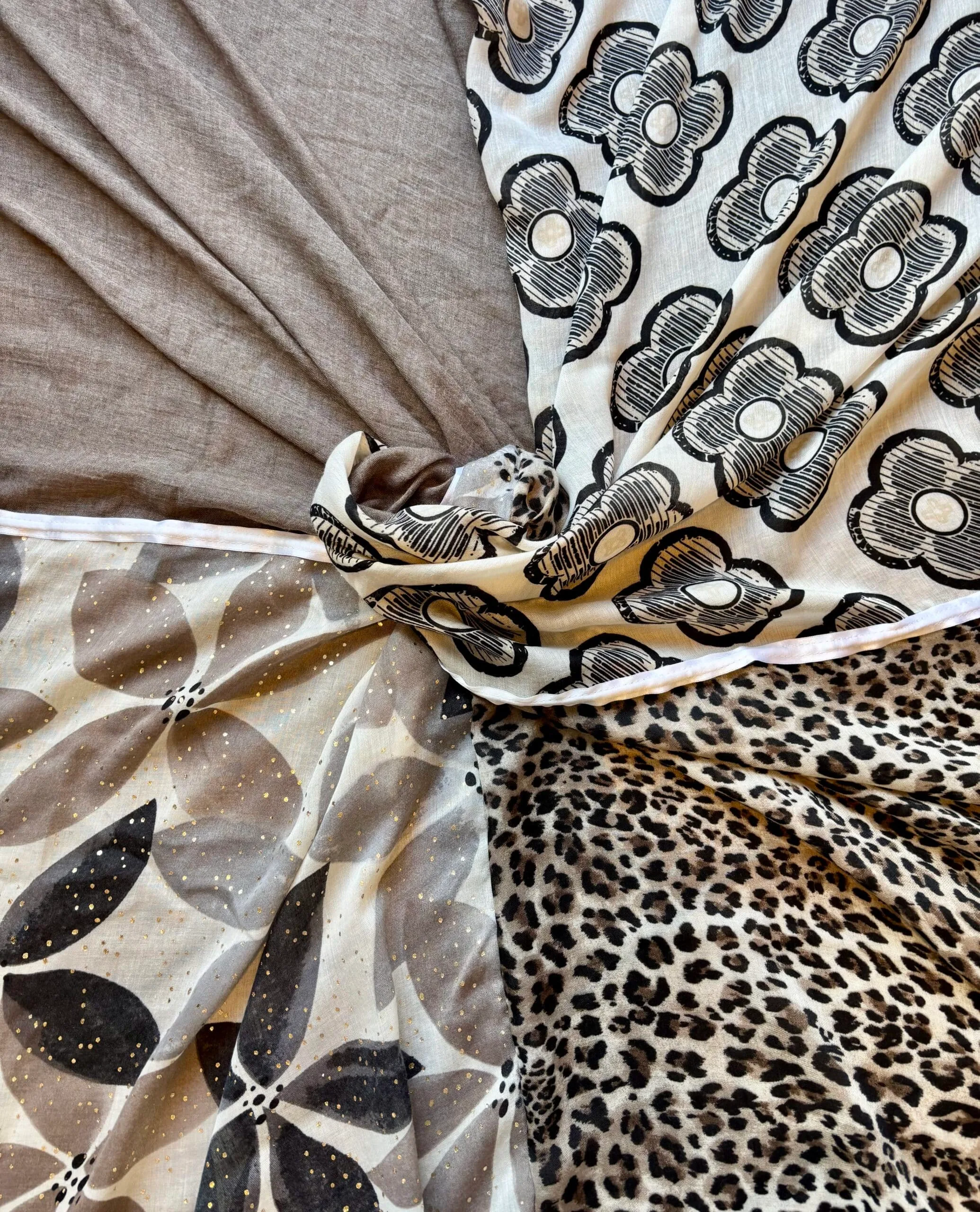 Ecru, taupe, gris clair, petit léopard taupe/noir.