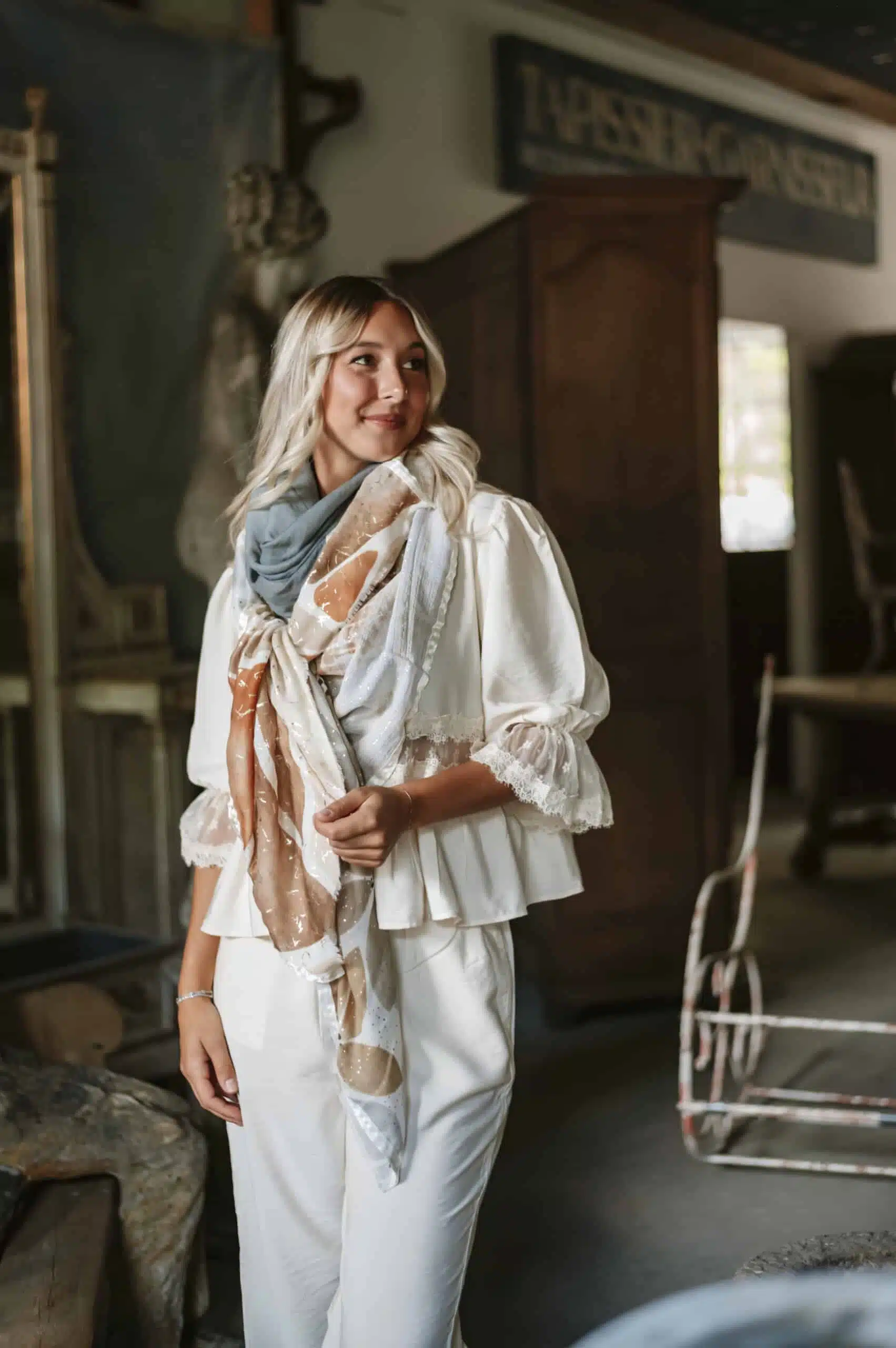 Le foulard Shanna est un assemblage de 4 morceaux de tissus différents, agrémenté de rubans décoratifs et assortis. Le carré Shanna Automne/hiver 2025 est moelleux, et agréable à porter. Il vous accompagnera en début de saison pour apporter couleurs et luminosité à vos tenues et il vous tiendra chaud les soirées d’hiver.