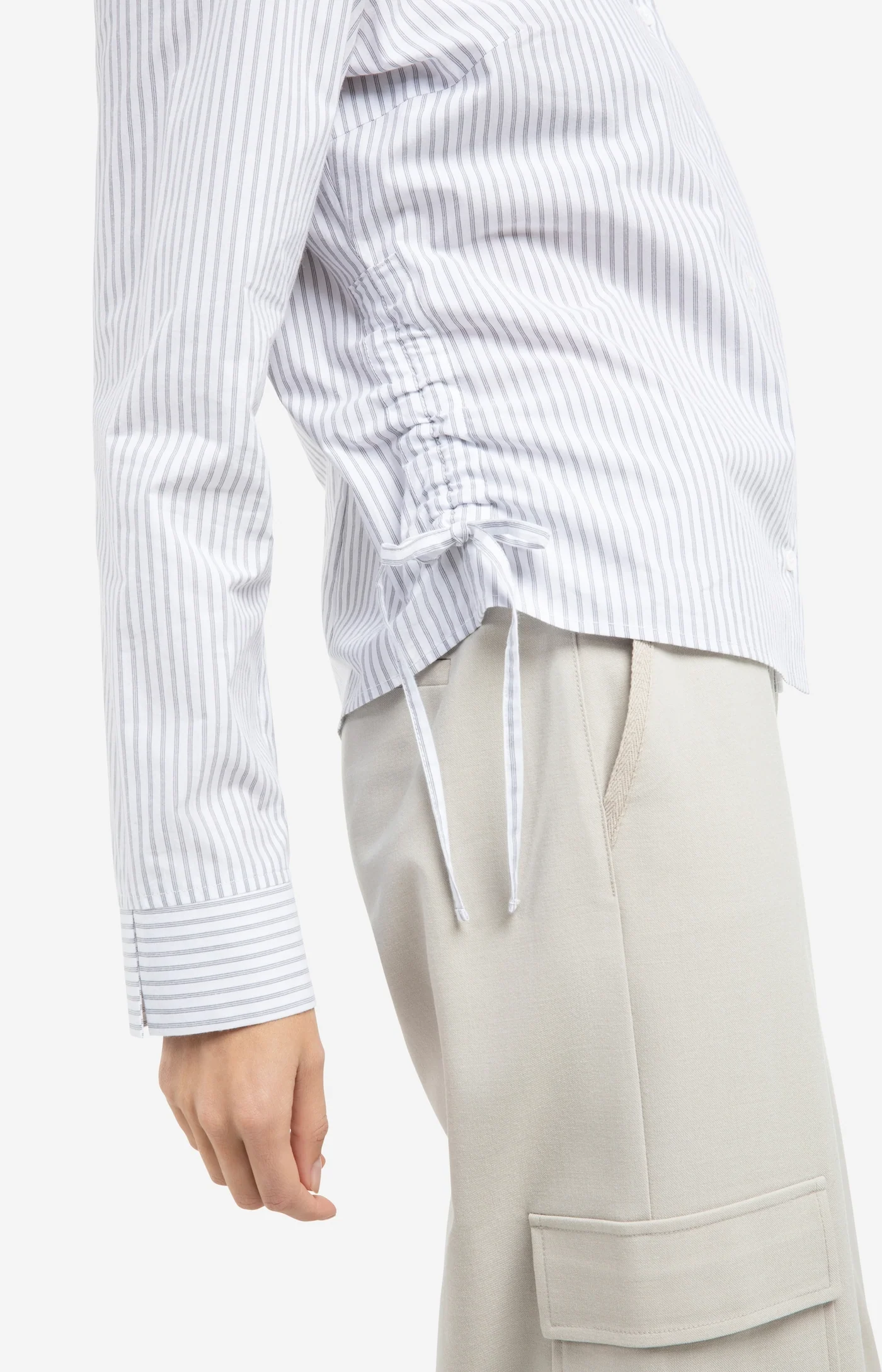 Cette chemise à rayures a une coupe cintrée, un col classique et des manches longues aux manchettes larges. Les liens sur les côtés vous permettent d’ajuster la coupe à la taille pour flatter votre silhouette. Les rayures horizontales sur les manchettes apportent une touche chic à la pièce. Une chemise tendance à porter dans des tenues professionnelles ou plus décontractées.