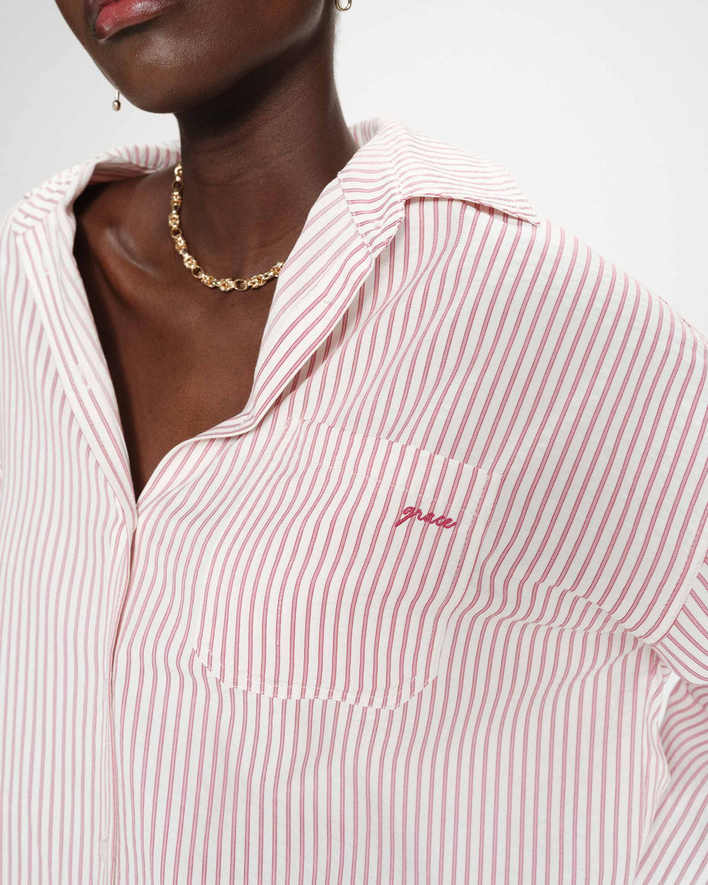 La chemise droite VIPERA, confectionnée dans un tissu rayé, mise sur une coupe décontractée pour un confort optimal au quotidien. Les détails de plis aux poignets et à l’empiècement dos de la chemise à rayures VIPERA ajoutent une touche de sophistication subtile. La broderie exclusive « grace » sur la poche plaquée apporte une signature délicate et unique.