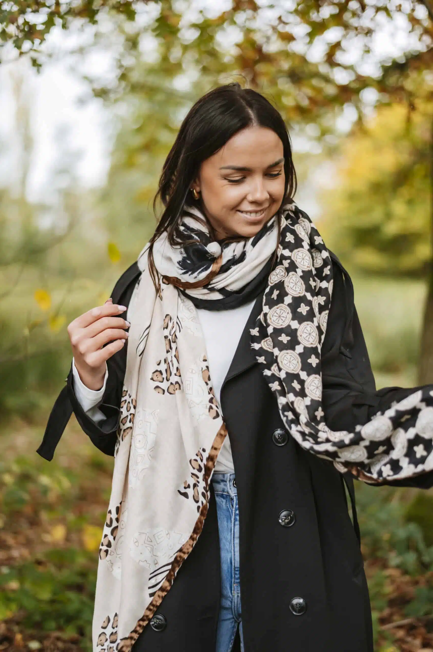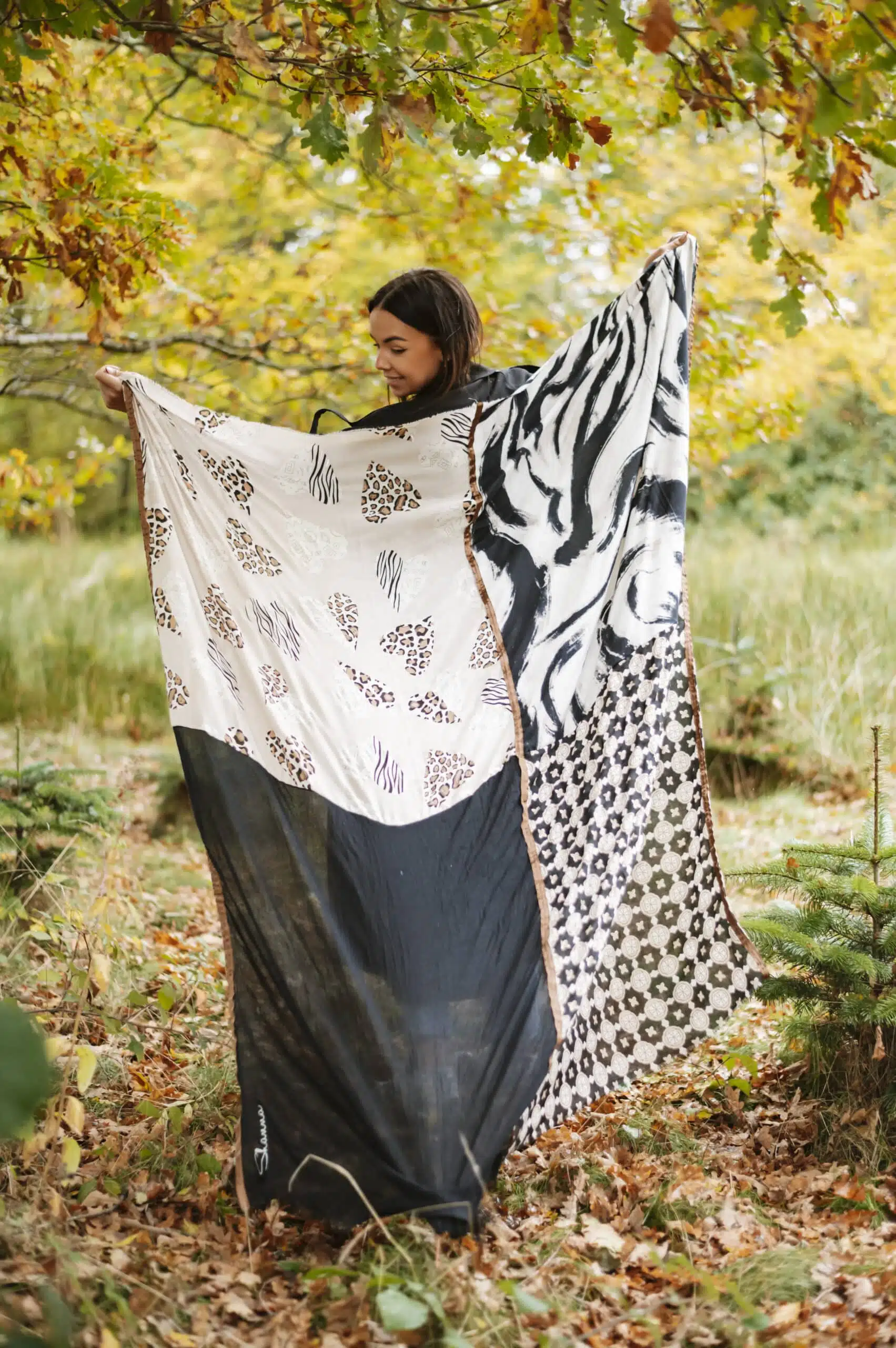 Le foulard Shanna est un assemblage de 4 morceaux de tissus différents, agrémenté de rubans décoratifs et assortis. Le carré Shanna Automne/hiver 2025 est moelleux, et agréable à porter. Il vous accompagnera en début de saison pour apporter couleurs et luminosité à vos tenues et il vous tiendra chaud les soirées d’hiver.