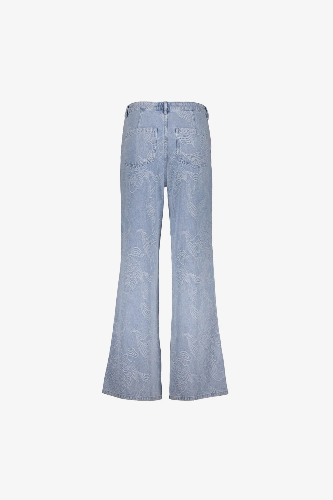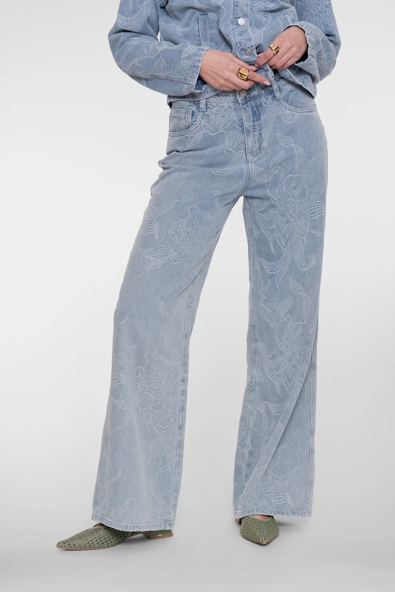 Jean’s taille haute et jambe large souple. Équipé de poches avant et arrière et de fermeture bouton. Le denim présente une structure florale jacquard raffinée dans un lavage frais.