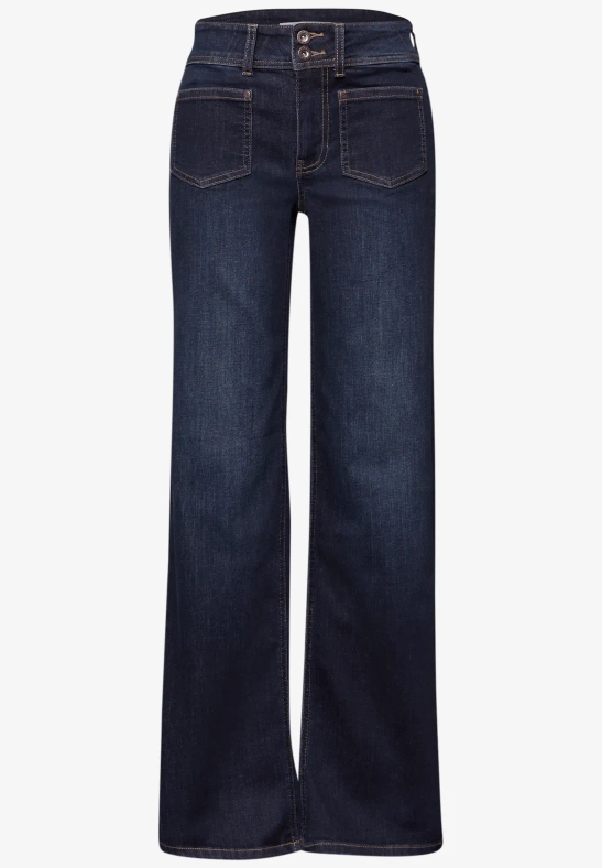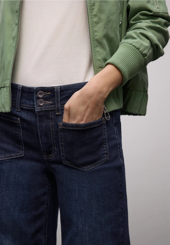 Ce jeans Wide Leg dans le style Emee de Street One pour femmes combine le chic de la mode avec un confort agréable. La coupe à taille haute et les poches plaquées créent une silhouette moderne, tandis que le délavage bleu foncé se combine de multiples façons. Le tissu denim stretch en fait un compagnon parfait pour ton quotidien.