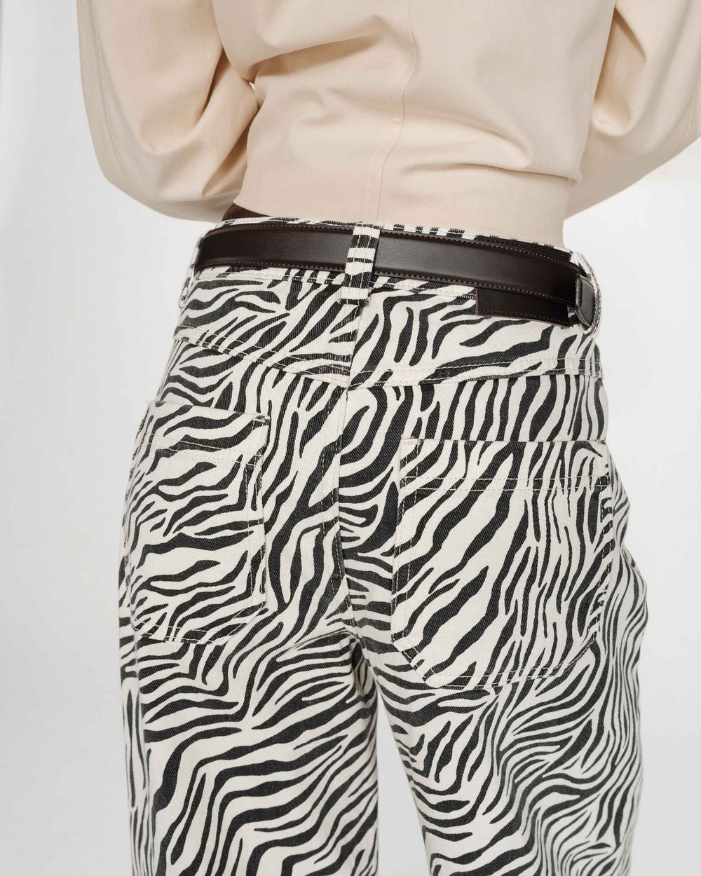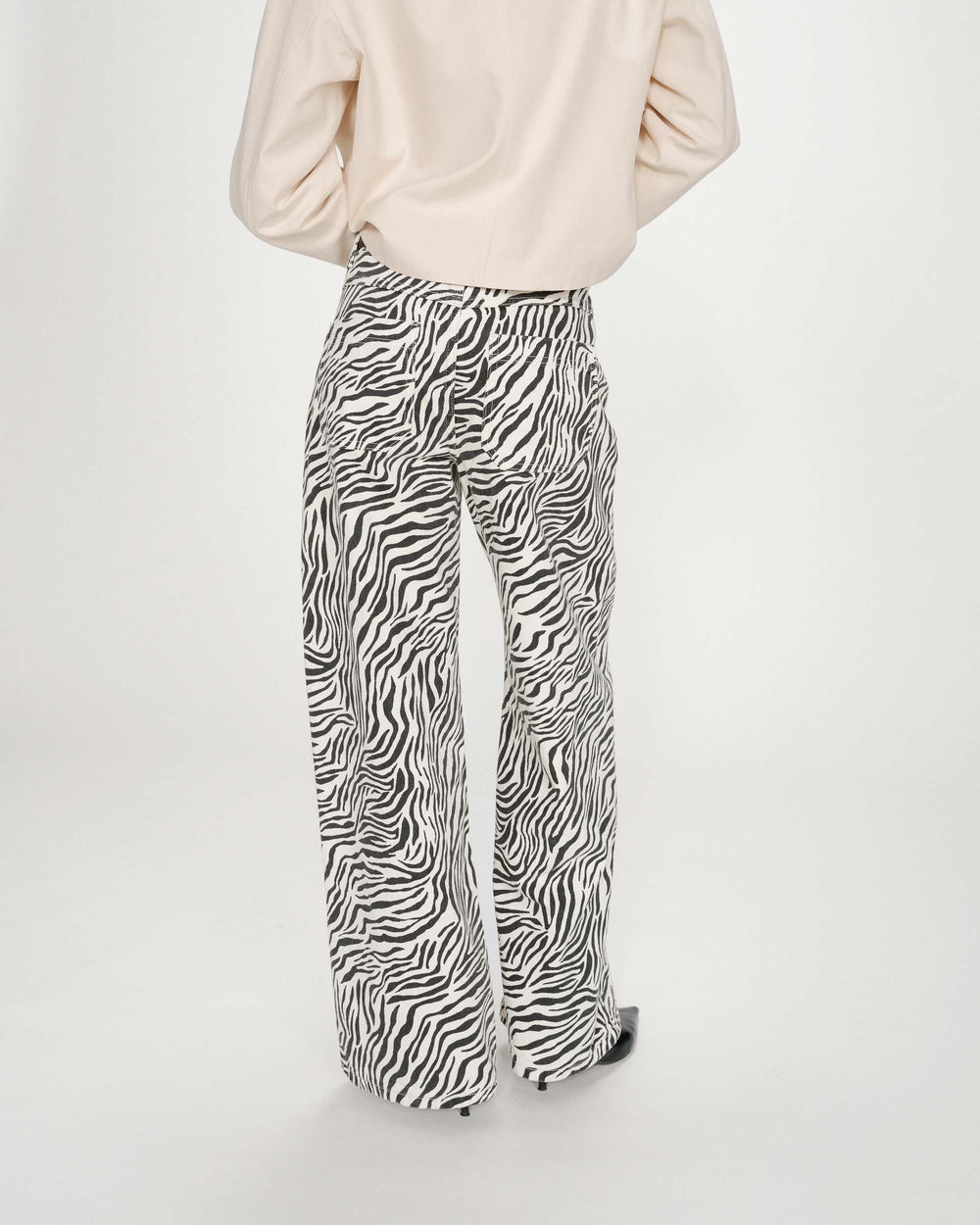 Le pantalon loose SOCCA revisite un imprimé tendance zèbre dans une coupe loose et dessine une silhouette moderne et assumée. La coupe taille haute et légèrement évasée en bas offre une allure décontractée et s’intègre facilement dans le vestiaire du quotidien. Le pantalon zèbre SOCCA est agrémenté d’une fermeture zippée boutonnée ainsi que d’un jacron en cuir au dos.