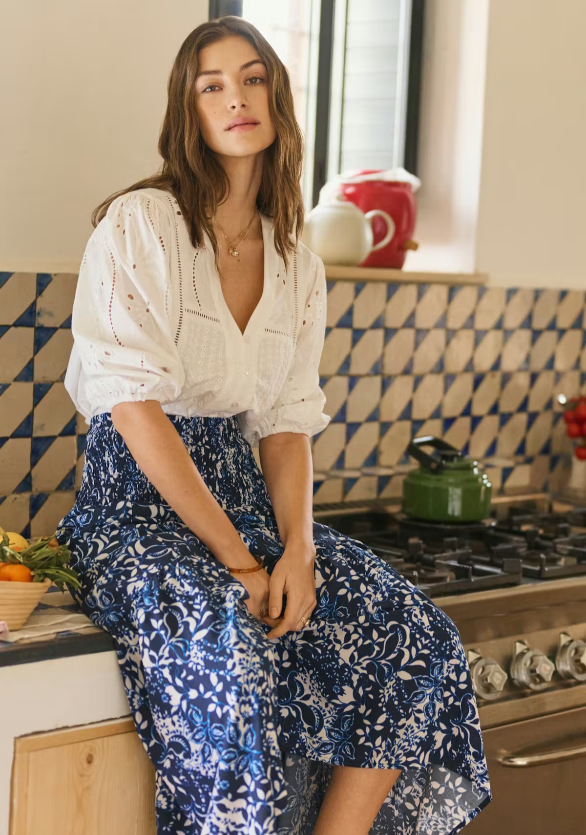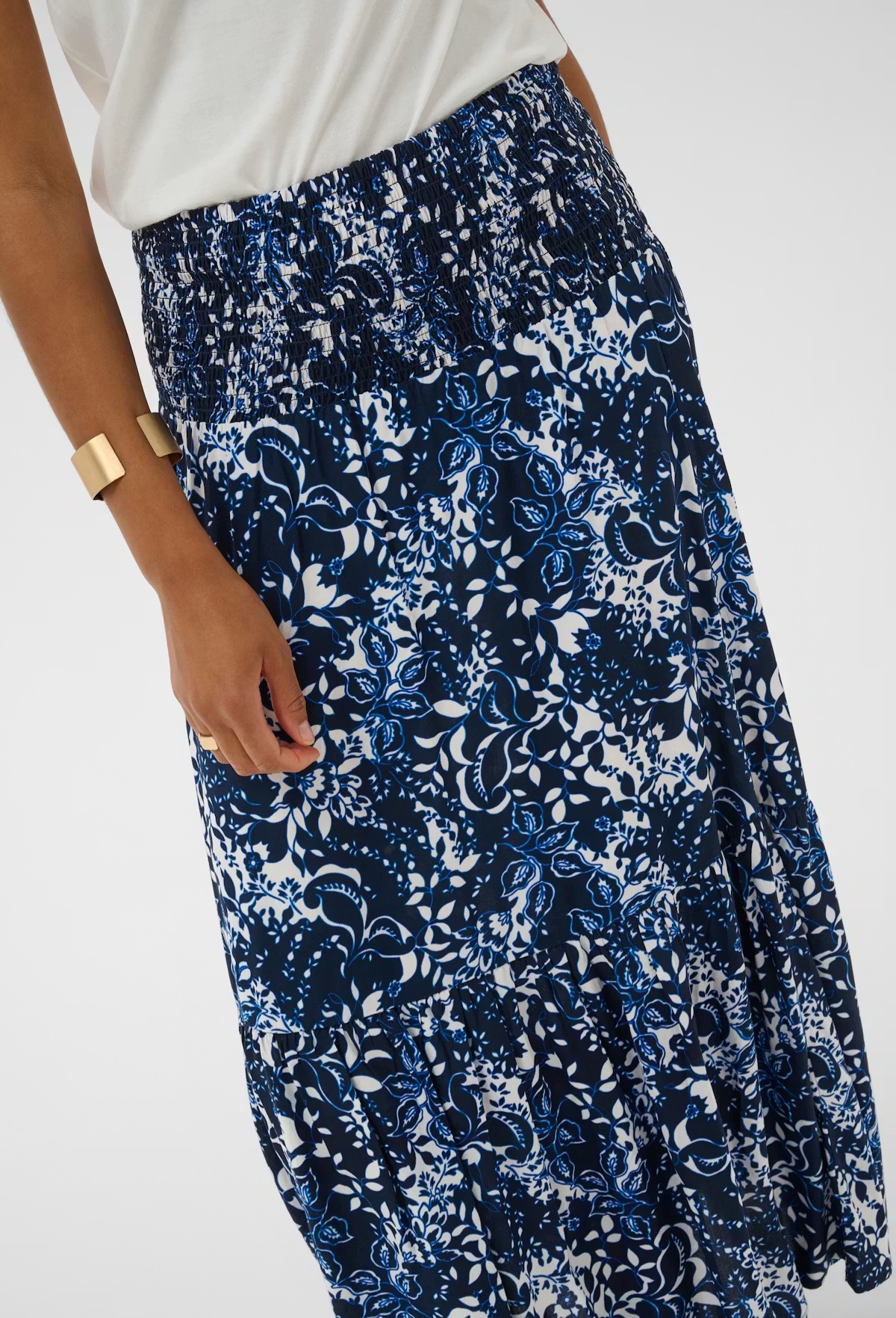 Cette jupe longue présente un joli imprimé d’inspiration florale et une matière légère et fluide.