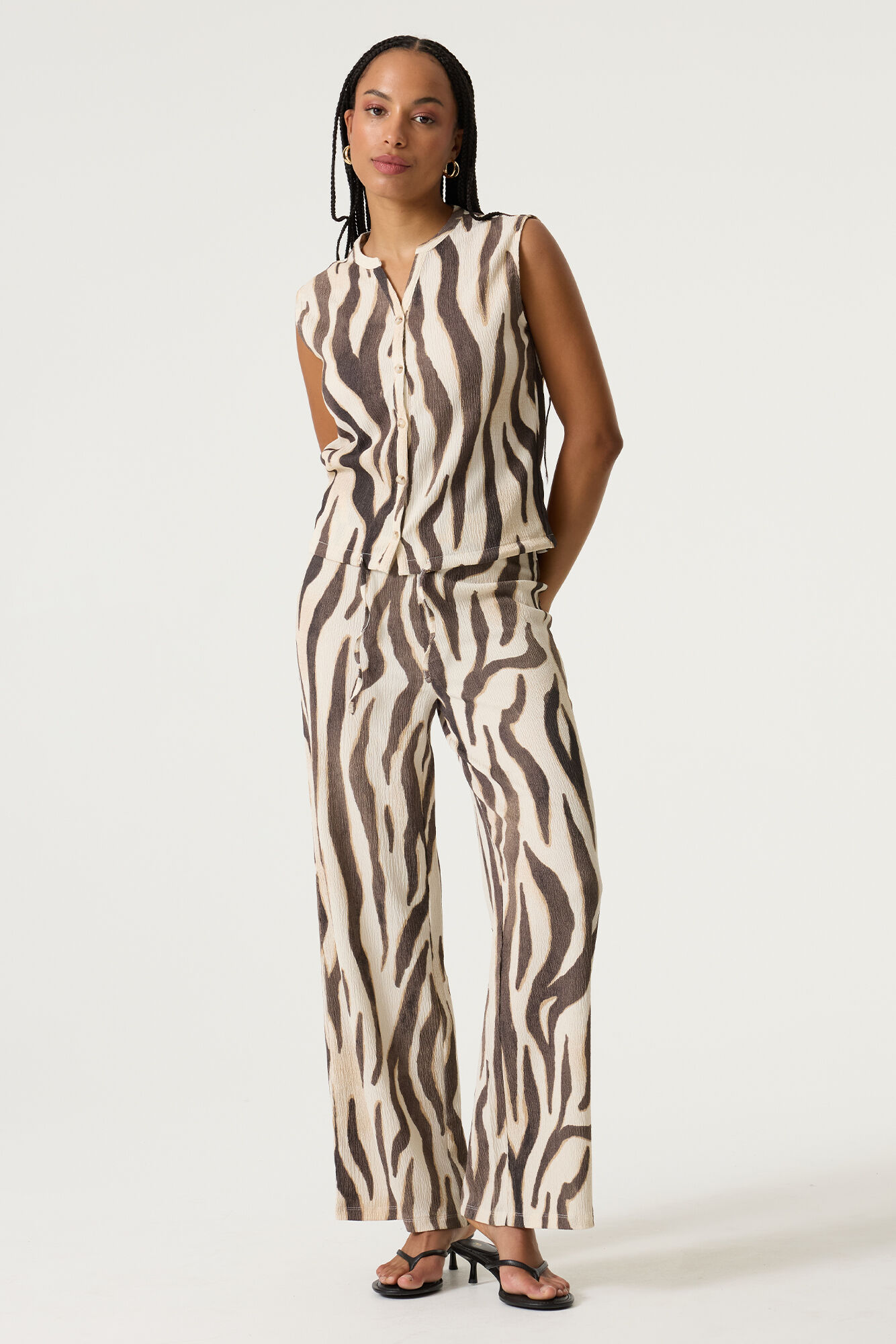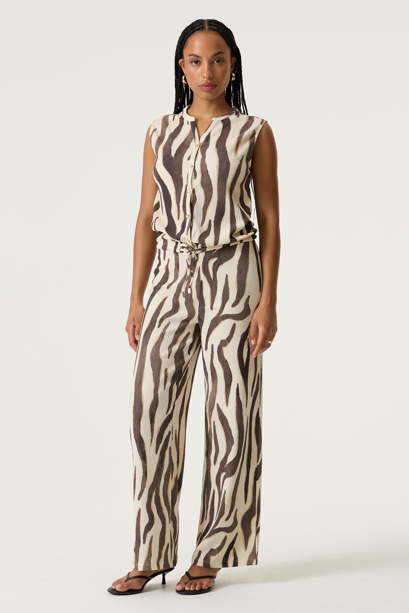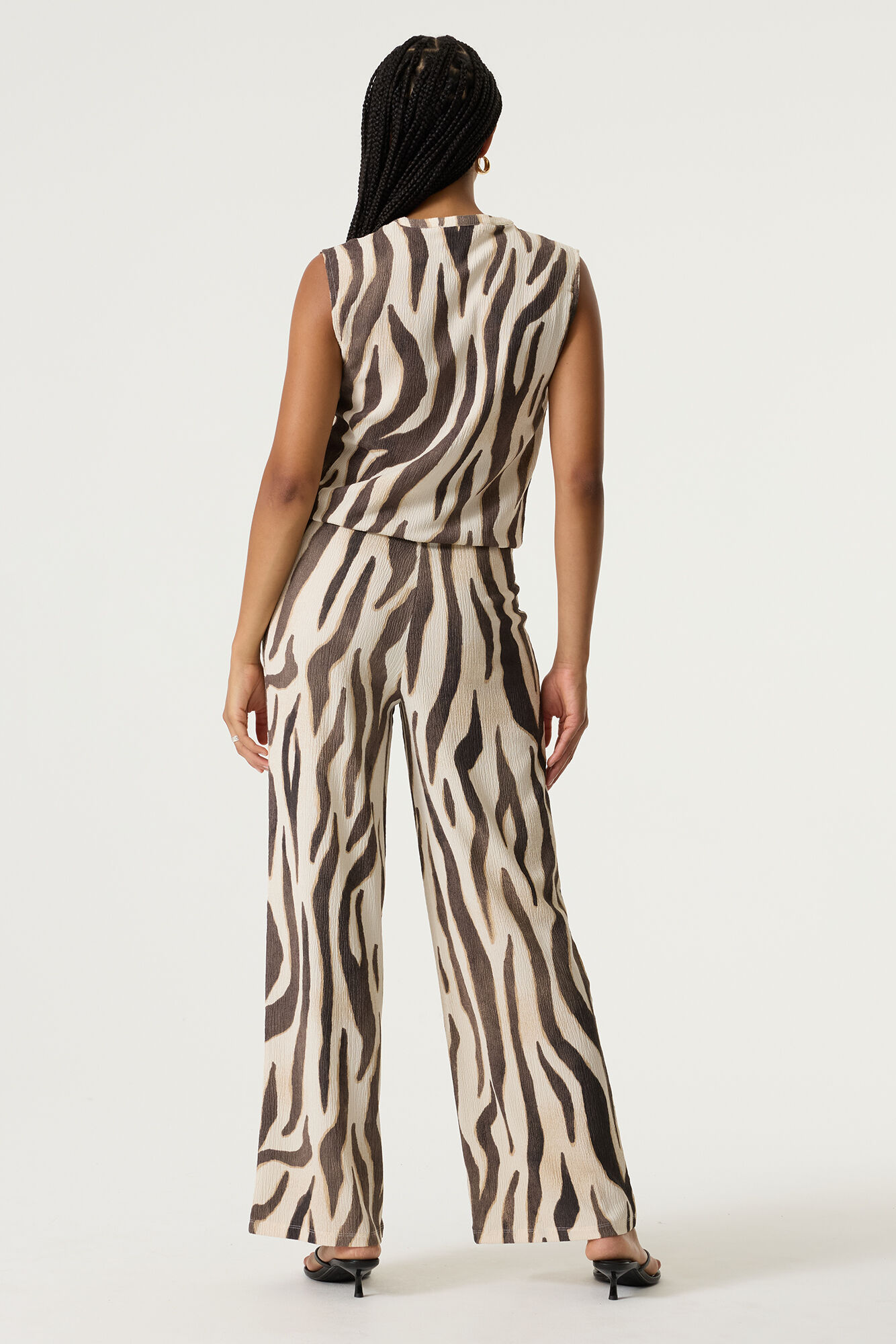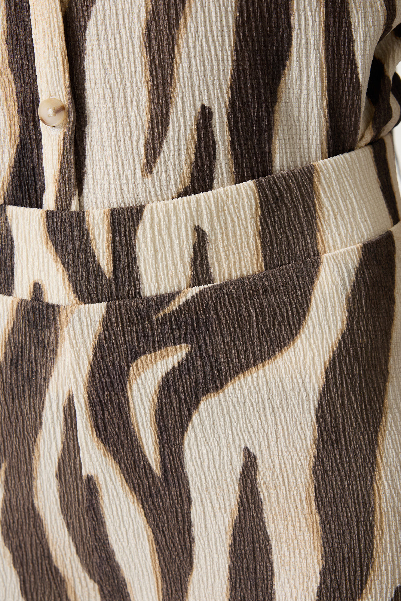 Pantalon froissé avec un imprimé partout. Ce pantalon a une taille haute, une ceinture élastique et une coupe large.