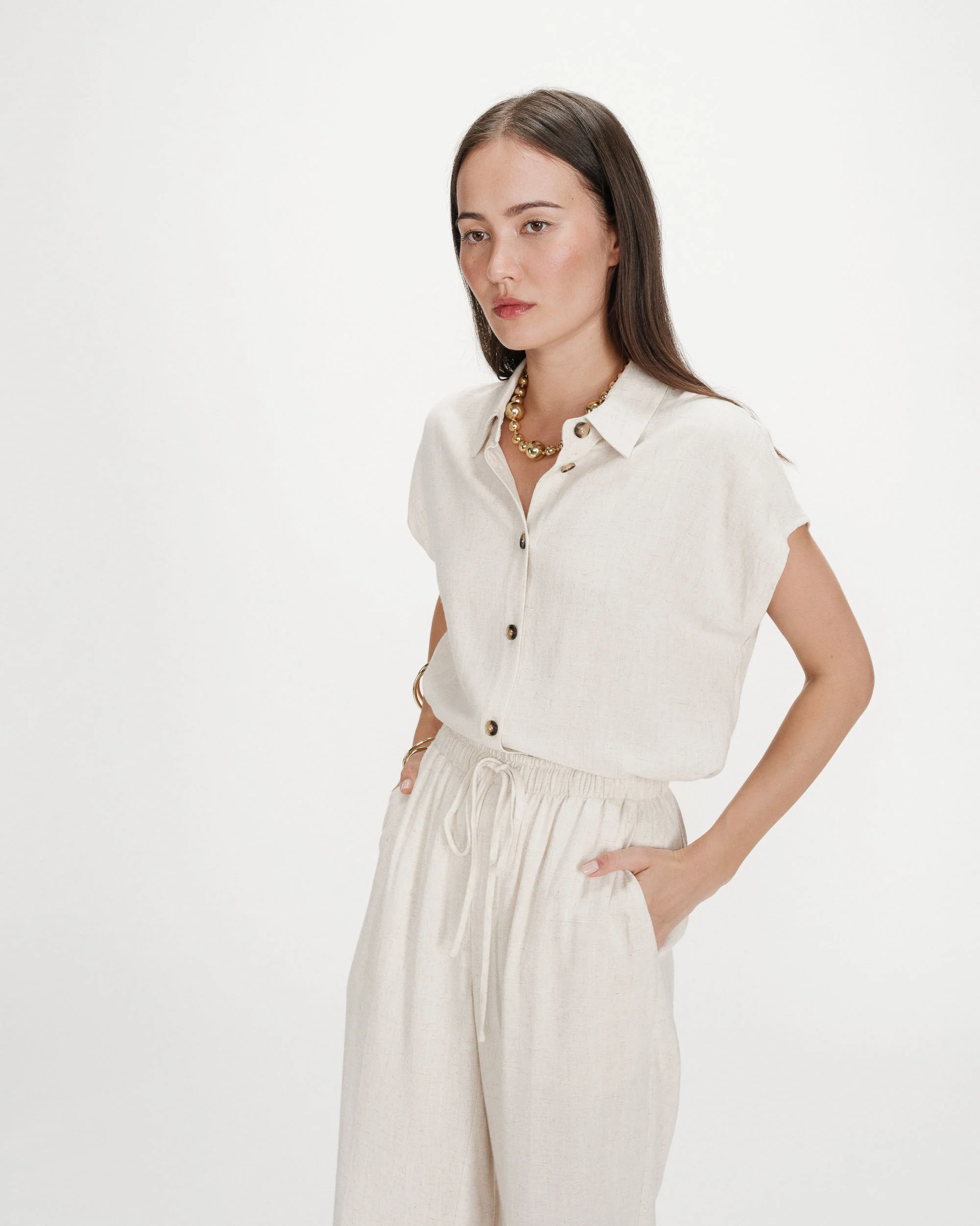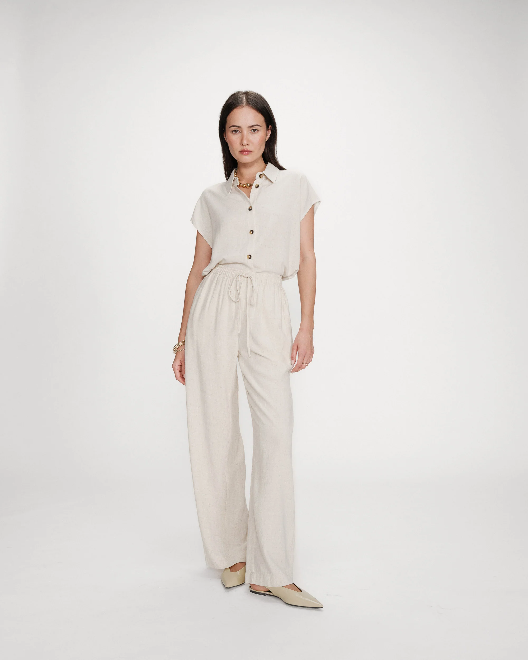 Le pantalon large RAVEN, confectionné dans un tissu en lin mélangé est une pièce simple et moderne. Le modèle présente une taille haute élastiquée avec un cordon de serrage et une coupe droite qui sublime les courbes féminine. Le pantalon fluide RAVEN est une pièce minimaliste et féminine qui s’intègre facilement dans le vestiaire du quotidien.