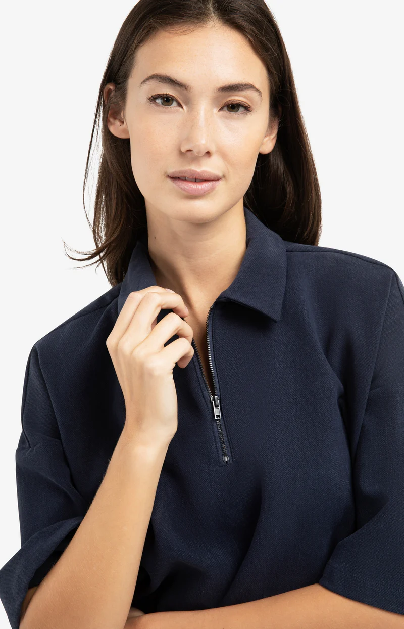 Ce polo moderne a une demi fermeture éclair, un col classique et des coutures tombantes sur les épaules.