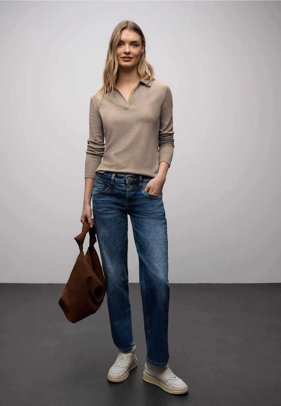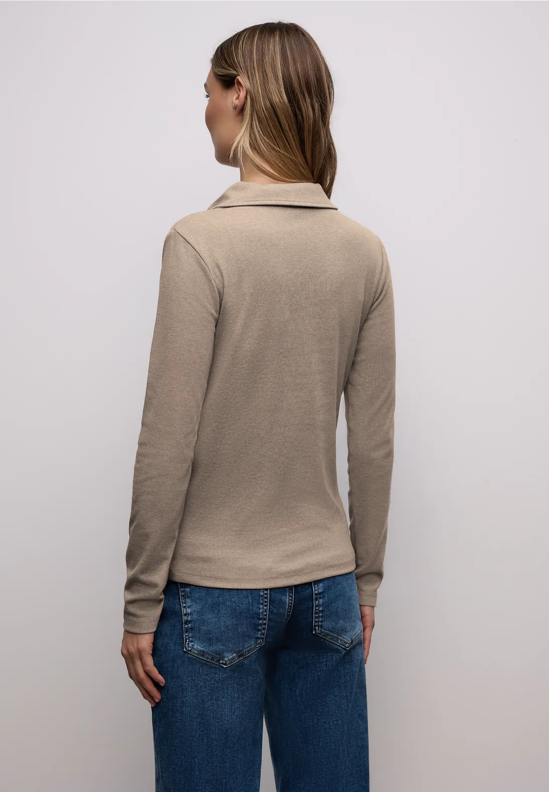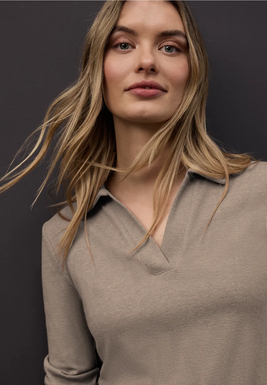 Ce t-shirt à manches longues de Street One pour femmes apporte un charme sportif à ton quotidien. Le col polo classique rencontre un aspect mélangé discret et une fine structure côtelée. La qualité du coton avec une part de stretch assure un grand confort et fait de ce t-shirt un partenaire polyvalent pour les looks décontractés.