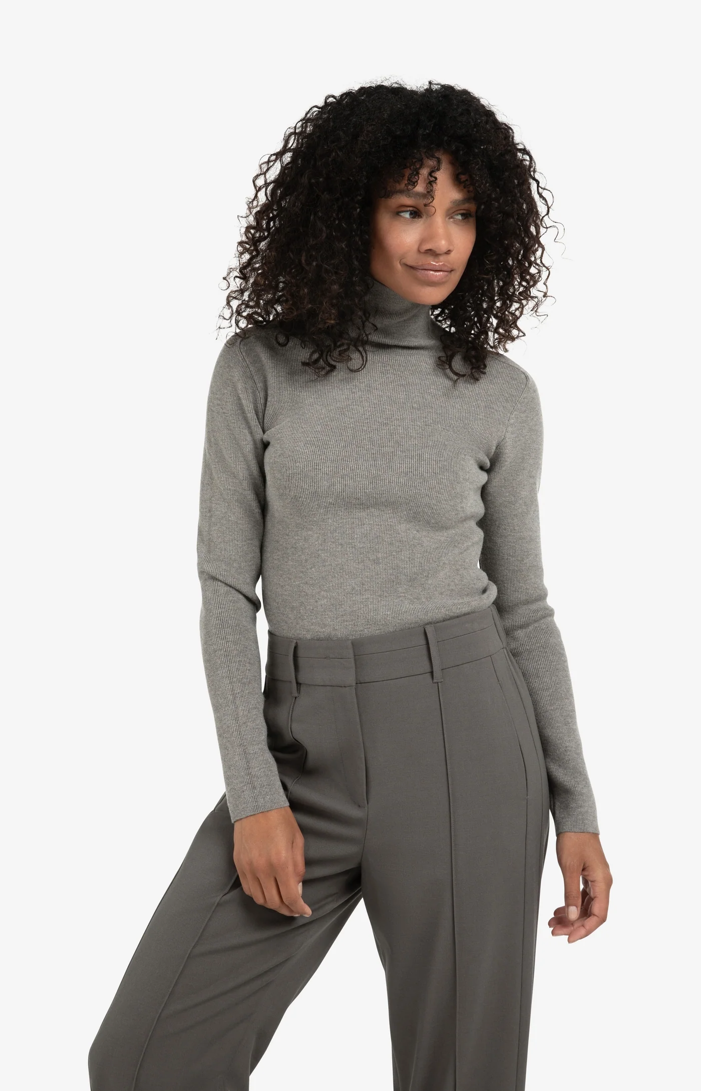 Ce haut côtelé doux présente un col roulé et une silhouette ajustée flatteuse. Confectionné en jersey extensible confortable, il présente des manches longues et une allure élégante qui épouse le corps. Parfait porté seul ou sous un blazer ou un cardigan pour une tenue chic et décontractée.