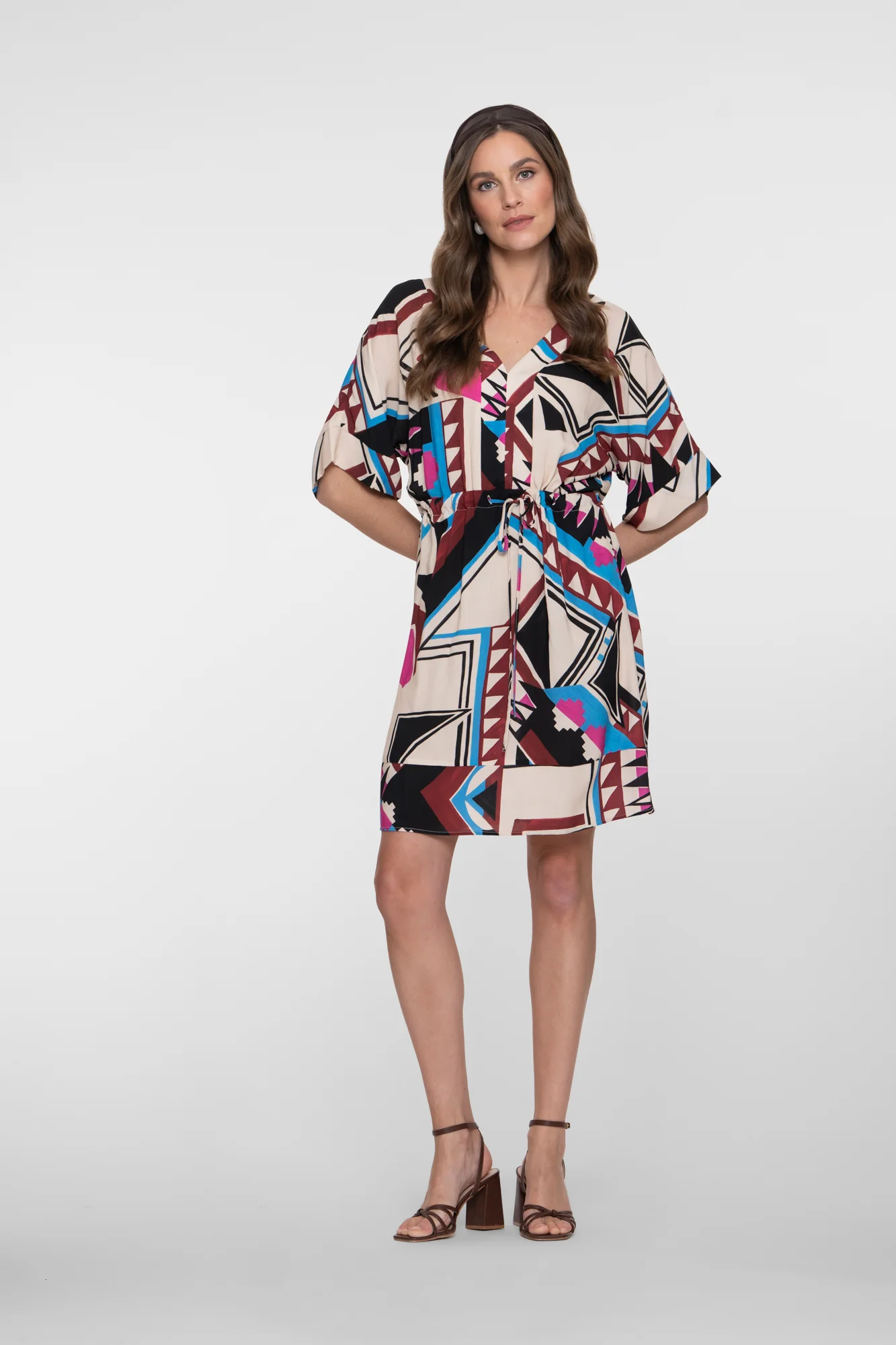 Cette robe est une pièce de caractère. L’imprimé graphique puissant, combiné au col en V féminin, donne un aspect moderne. Les manches papillon créent une silhouette légère, tandis que le cordon à la taille accentue subtilement votre silhouette. Une mini-robe qui s’accorde parfaitement à la fois avec un look citadin et une journée à la plage.