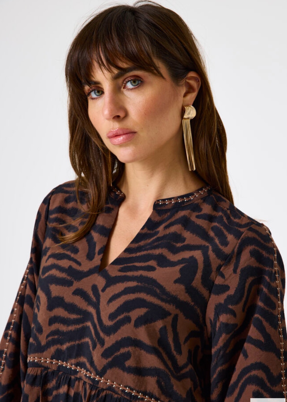 Robe à imprimé allover. Cette robe a un col en Y, des manches trois-quarts et une coupe décontractée.