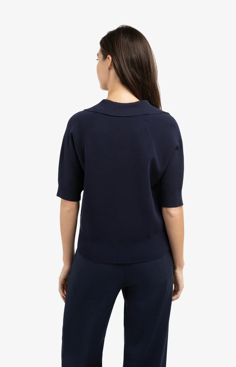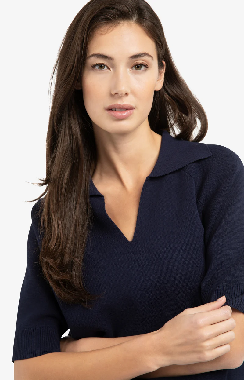 Ce pull raffiné fait à partir d’une maille douce a une grande encolure en V et un élégant col.