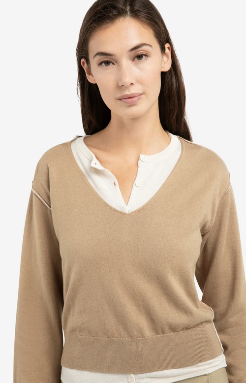 Ce pull doux a un col en V, des manches longues ainsi que des finitions en contraste sur l’encolure et les coutures pour créer un effet superposé.