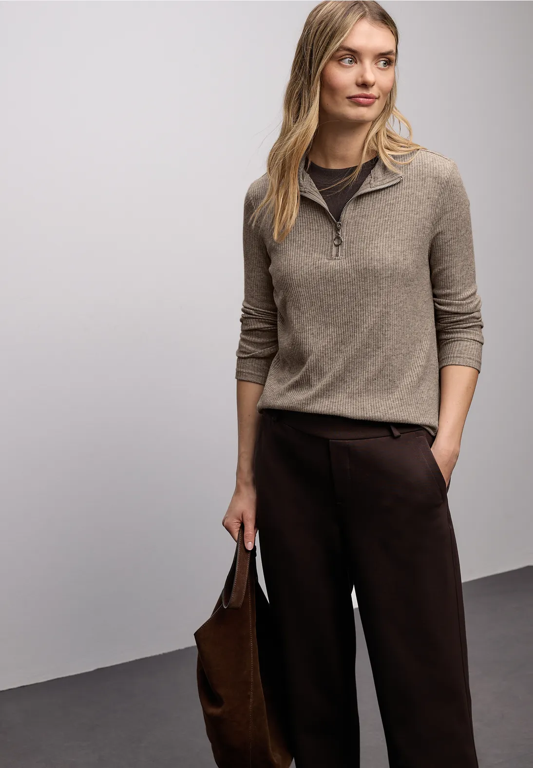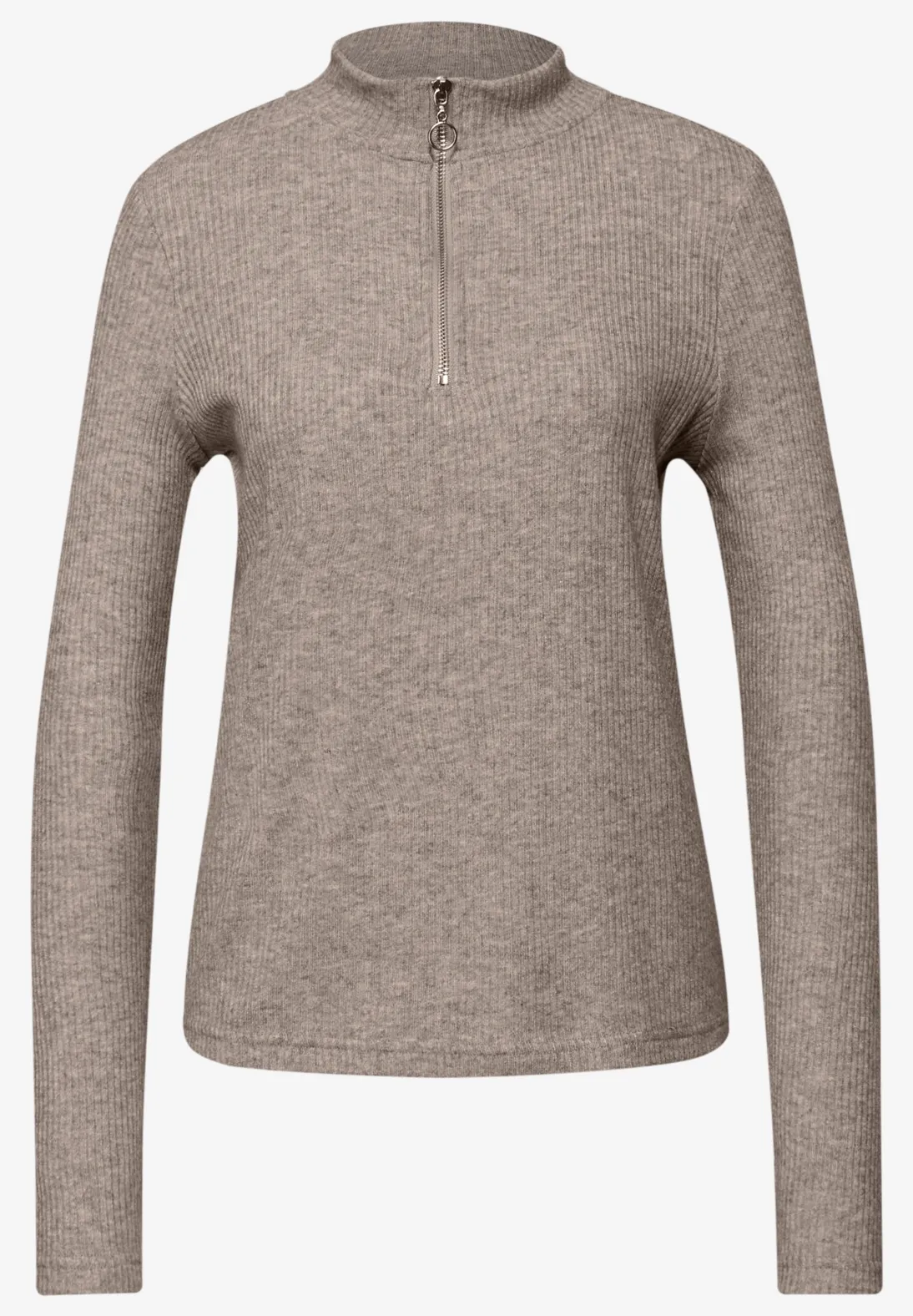 Ce t-shirt de Street One pour femmes marque des points avec sa structure finement côtelée et son turtleneck avec une fermeture éclair pratique. Le doux mélange de viscose assure un port agréable et un grand confort. Un superbe basique pour les journées fraîches et les looks stylés.