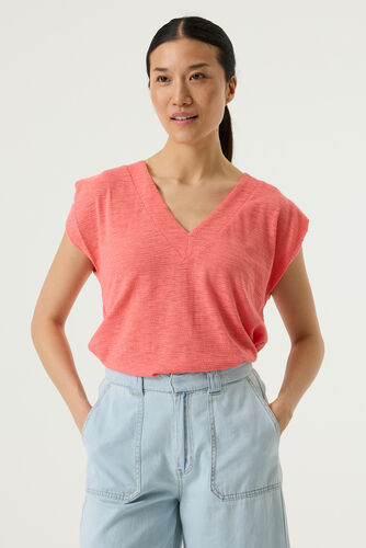 Ce T-shirt a des manches courtes, un col en V et une coupe régulière.