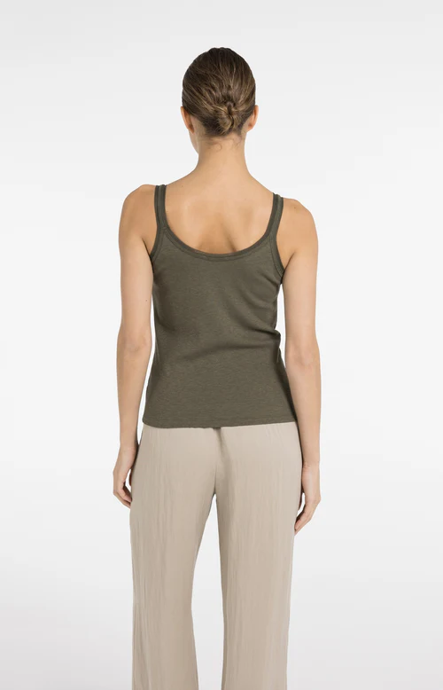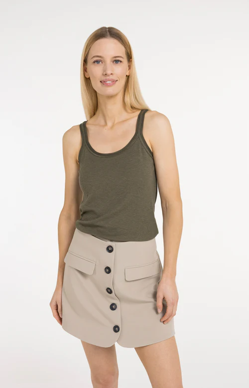 Cet élégant débardeur a des bretelles larges, un col rond et une coupe ajustée et féminine.