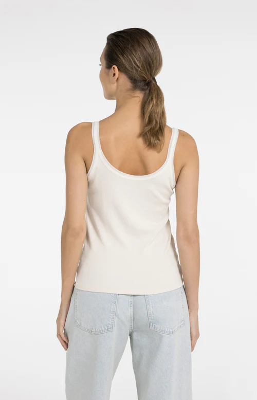 Cet élégant débardeur a des bretelles larges, un col rond et une coupe ajustée et féminine.