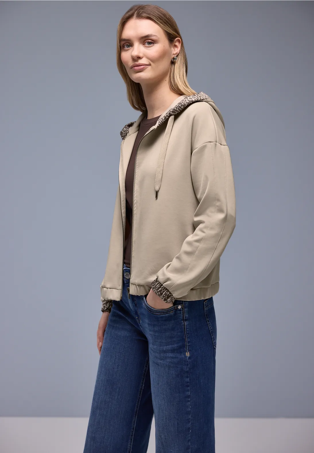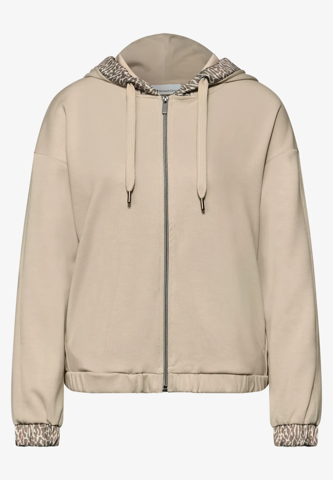 Cette veste à capuche de Street One pour femmes combine un style sportif avec une élégance féminine. La brillance soyeuse et les accents léopard sur la capuche et les poignets lui confèrent un look particulier. Des poches latérales, une taille élastique et un mélange de modal stretch en font ta nouvelle pièce préférée pour les moments décontractés du quotidien.