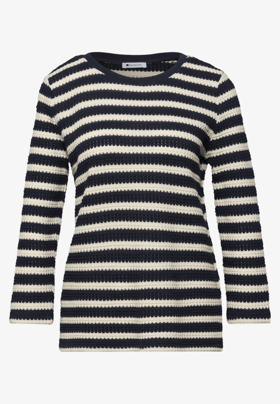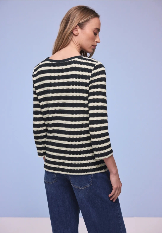 Le t-shirt rayé au look tricot de Street One pour femmes est idéal pour le quotidien et se combine de multiples façons. Le doux mélange de coton et les manches 3/4 le rendent confortable, tandis que l’encolure U-Boot apporte une touche de féminité. Un t-shirt qui se combine idéalement – décontracté, confortable, moderne.